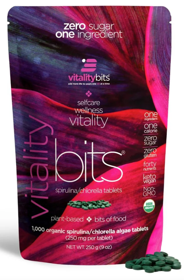 VITALITYbits® are USDA certified organic and are so concentrated with protein, chlorophyll, vitamins and minerals, they can replace most of your supplements, greens, protein or snacks. Spirulina satisfies your hunger, aids fasting and weight loss, energizes your day and boosts your skin health. Chlorella, a detoxifying green algae, supports immune health and gut health, eliminates heavy metals and toxins, improves sleep, digestion, and elimination.